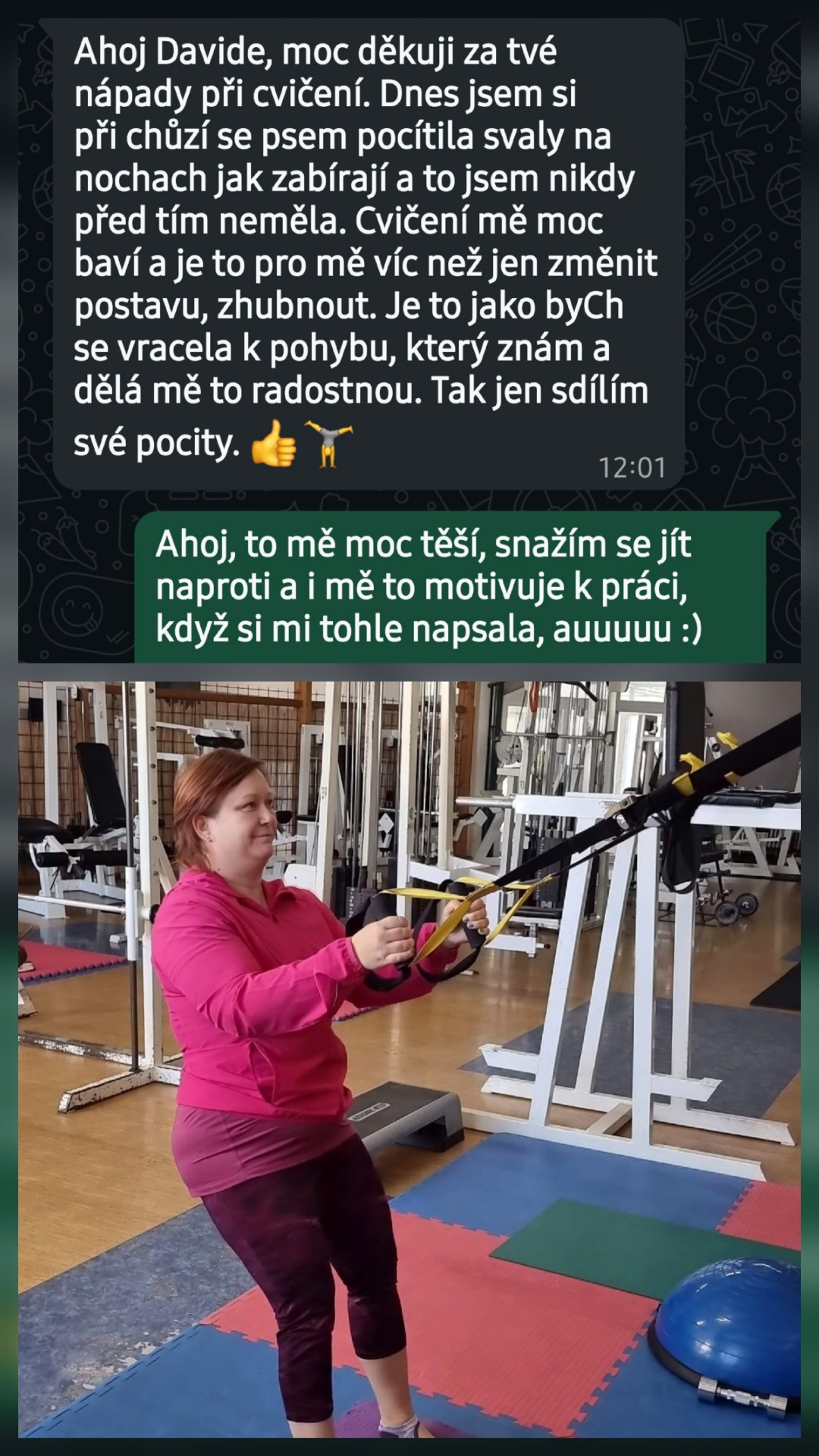 Ahoj Davide, moc děkuji za tvé nápady při cvičení. Dnes jsem při chůzi se psem pocítila svaly na nohách jak zabírají a to jsem nikdy před tím neměla. Cvičení mě moc baví a je to pro mě víc, než jen změnit postavu, zhubnout. Je to jako bych se vracela k pohybu, který znám a dělá mě to radostnou. Tak jen sdílím své pocity.