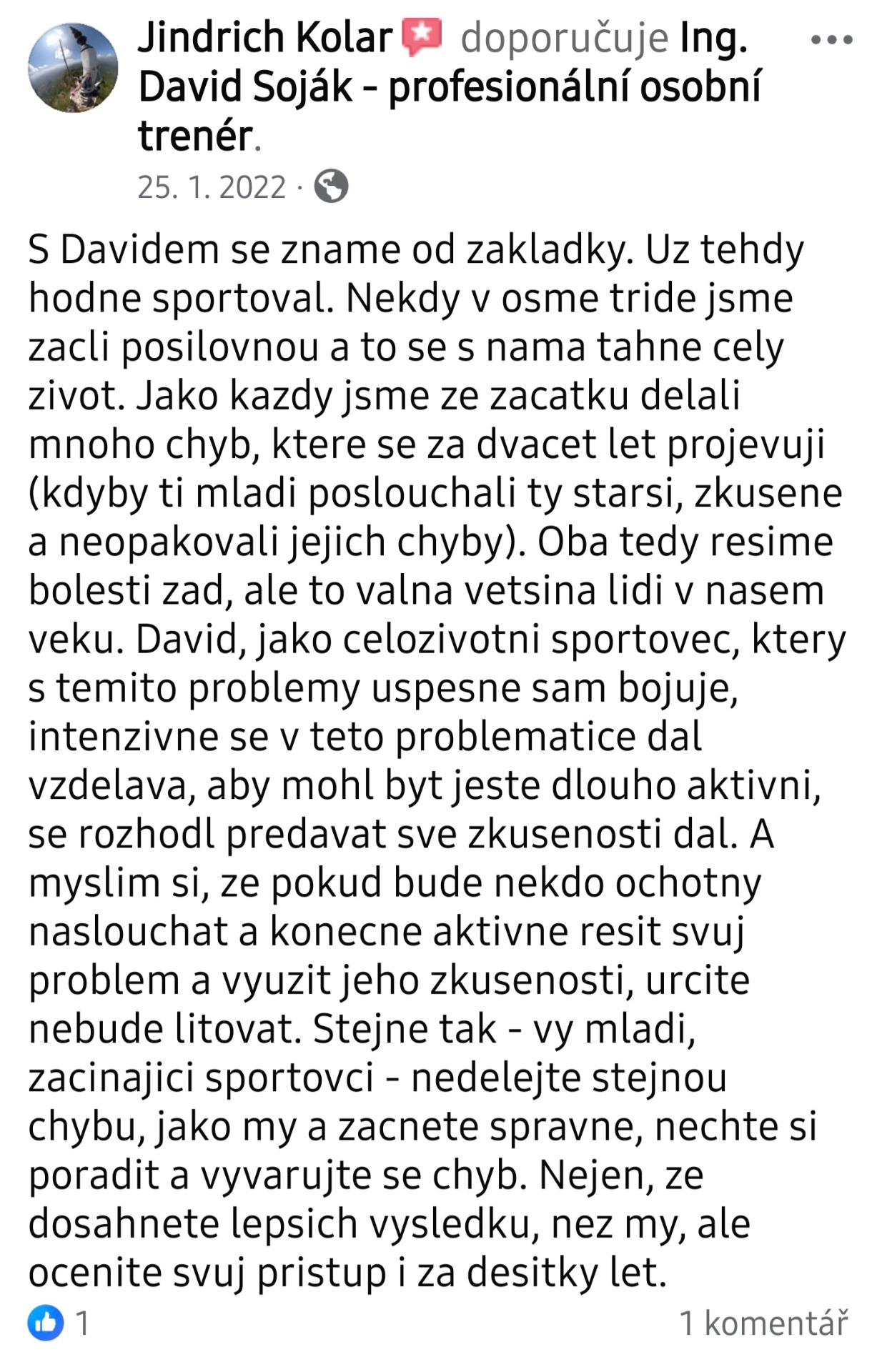 S Davidem mám dlouholeté zkušenosti a vždy mi ochotně poradí, když potřebuji něco vědět v oblasti cvičení, při bolestech zad, atd doporučuji